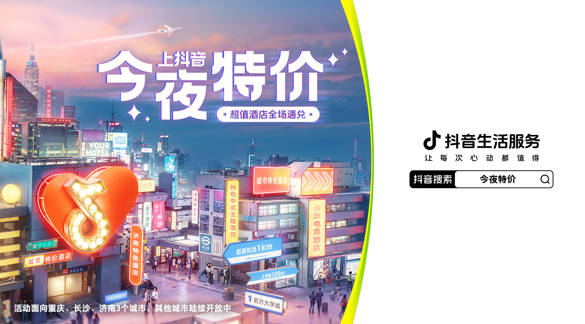 旅行必然伴隨住宿需求,而近些年愈發(fā)不愿提前規(guī)劃的年輕人們,更希望“開盲盒式”的出行體驗(yàn)。為此,抖音生活服務(wù)近日在長(zhǎng)沙、重慶、濟(jì)南三個(gè)城市,試點(diǎn)上線「今夜特價(jià)」酒店通兌活動(dòng)。聯(lián)合多家連鎖酒店及長(zhǎng)沙覓隱酒店、重慶江畔假日酒店等城市高檔型、舒適型酒店,開啟69/79/99/129/159/199等價(jià)格帶“同城千店通兌”。無論是旅行、差旅,還是日常需求,都為用戶提供便捷、實(shí)惠、省心的住宿選擇。
