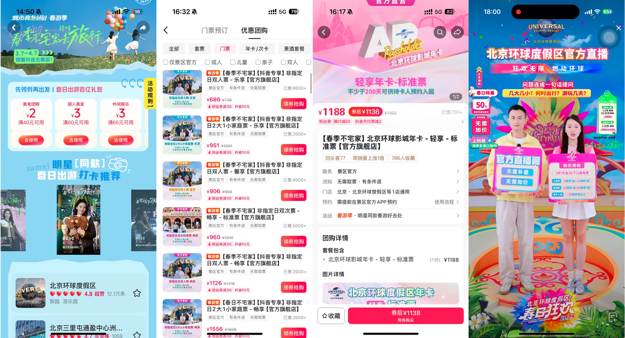 平臺(tái)+商家組隊(duì),共創(chuàng)協(xié)同增長 抖音生活服務(wù)「城市奔赴計(jì)劃·春游季」和商家組隊(duì)放大招,探索平臺(tái)與商家的協(xié)同增長新出路。北京環(huán)球影城直接開卷:平臺(tái)獨(dú)家推出雙人春日票、家庭套票,精準(zhǔn)拿捏遛娃黨、約會(huì)黨的需求;商家加碼專屬立減券,年卡和團(tuán)購品銷量起飛;7大主題直播間輪番上演“環(huán)球限定版”春日狂歡,邊逛邊搶福利,交易額一路狂飆!