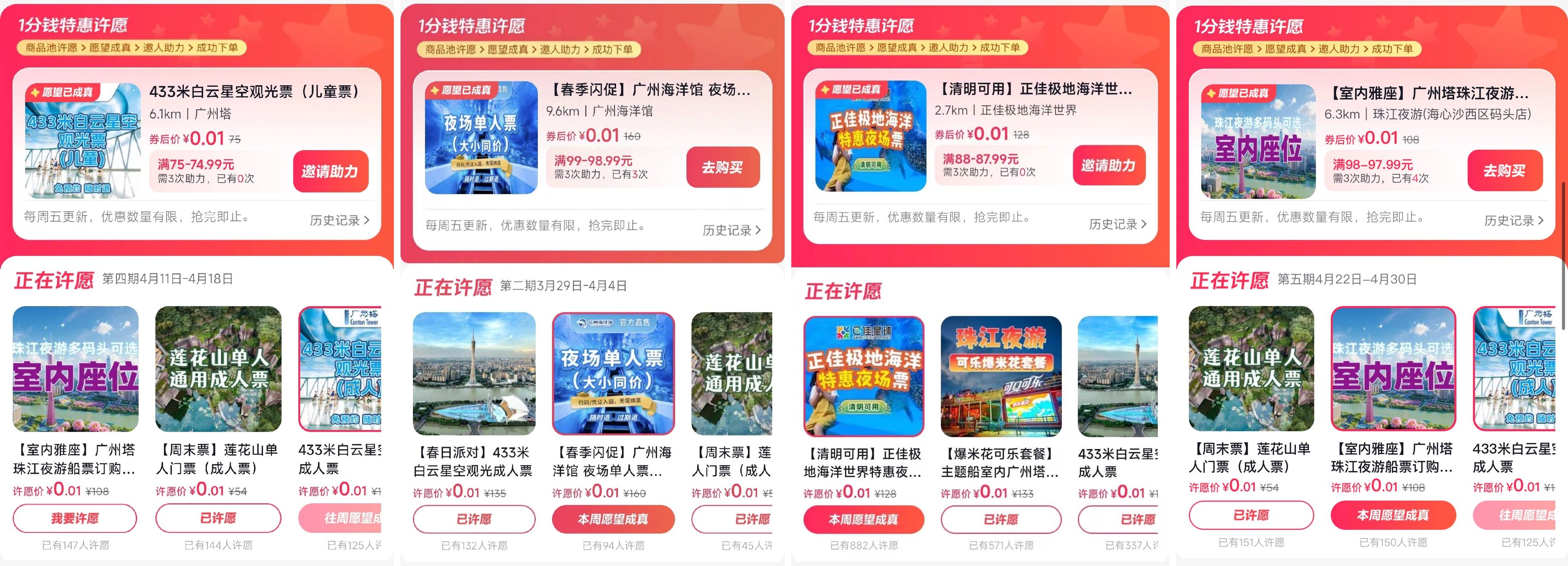 線下大事件之外,線上傳播以福利玩法、達(dá)人種草與社群滲透,推動活動熱度持續(xù)攀升。預(yù)熱期間,「去哪玩」頻道圍繞春日氛圍推出“1分錢許愿旅行”活動。用戶只需邀請好友助力,即可有機會以0.01元的價格獲得心儀景區(qū)的福利套餐。抖音用戶積極參與許愿,活動首期促成 5250 萬元交易額,形成 “社交裂變 - 流量轉(zhuǎn)化 - 口碑傳播” 的正向循環(huán)。