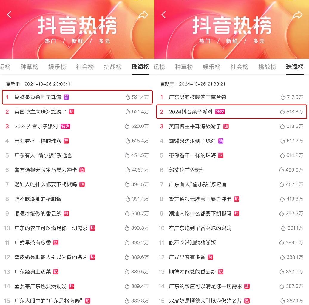 與此同時(shí),演唱會(huì)的線上直播也同步進(jìn)行,諸多網(wǎng)友跟隨“第二現(xiàn)場”的節(jié)奏,“云體驗(yàn)”了一番現(xiàn)場的嗨玩氛圍,與演唱會(huì)現(xiàn)場觀眾共同見證了這場音樂與歡樂交織的盛會(huì)。值得一提的是,當(dāng)天相關(guān)活動(dòng)話題熱度迅速攀升,#蝴蝶泉邊殺到了珠海 登抖音珠海同城榜TOP1 #2024抖音親子派對(duì) 抖音珠海同城榜TOP2。