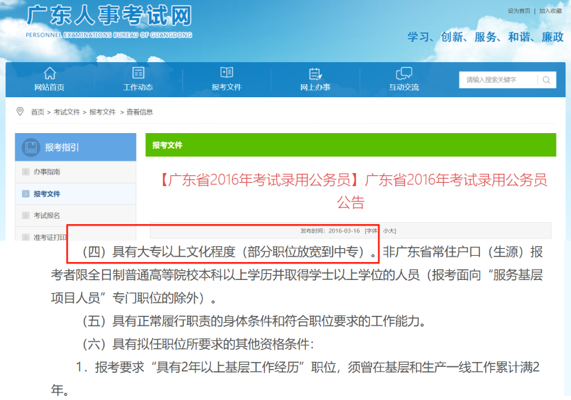 圖為廣東公布的2016年廣東省考試錄用公務(wù)員公告對報考者的學(xué)歷要求