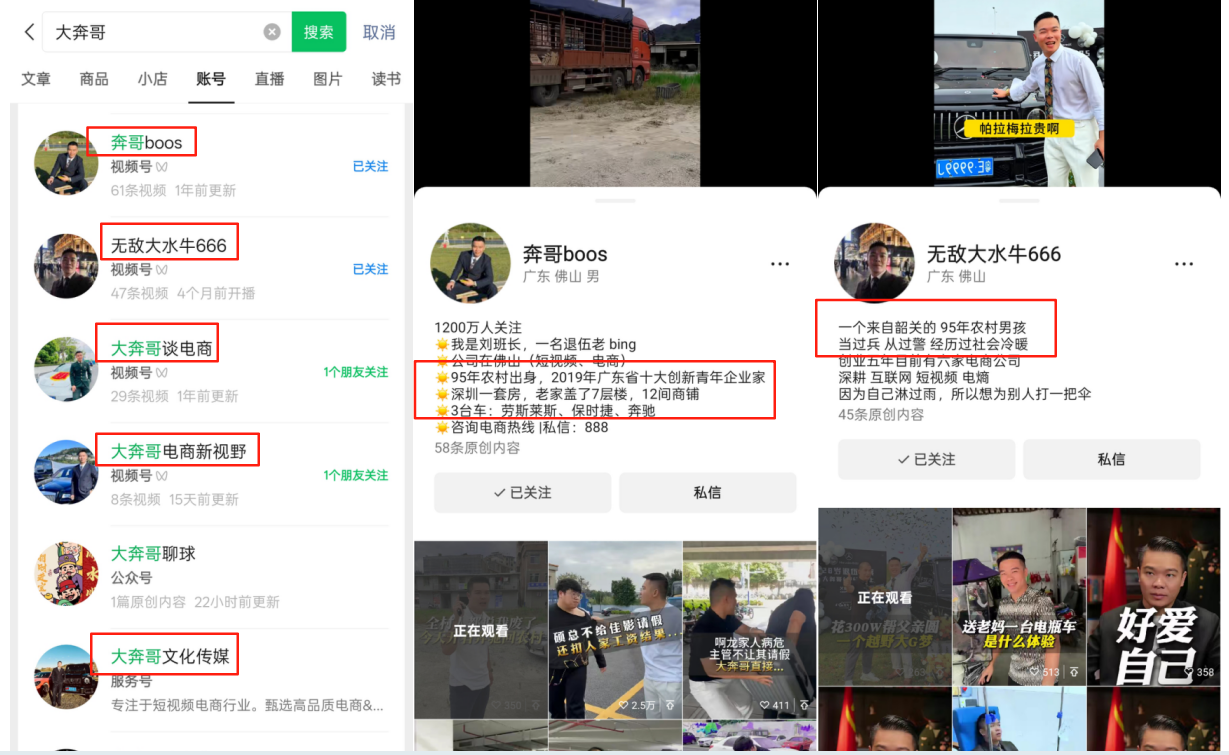 圖為在短視頻平臺上的搜索“大奔哥”出現(xiàn)的賬號