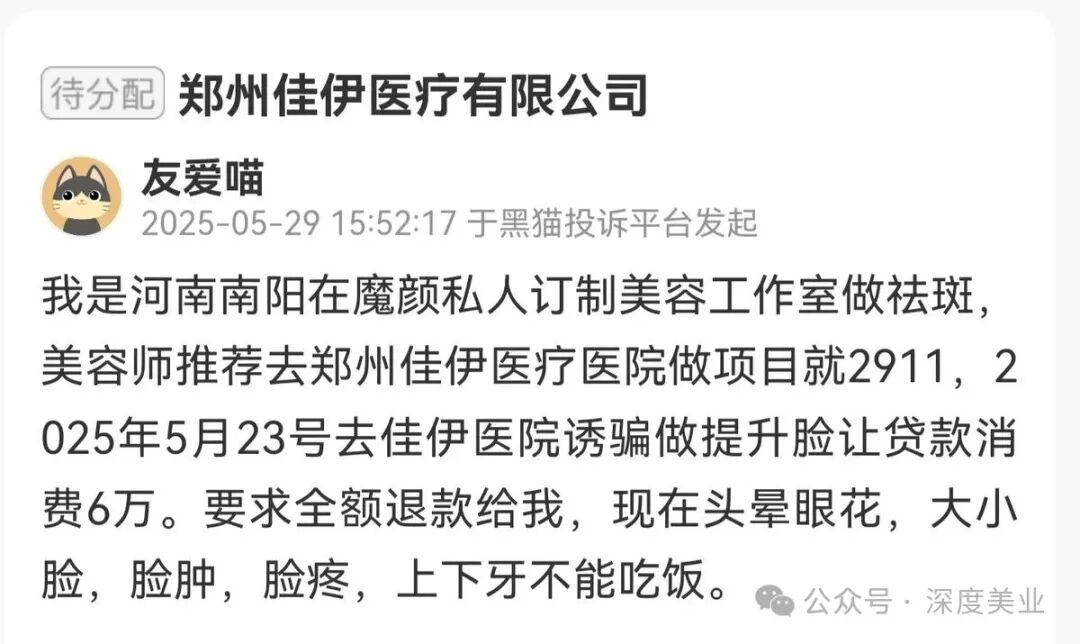 2024年10月30日,還有消費(fèi)者在黑貓投訴平臺(tái)發(fā)起對(duì)鄭州佳伊醫(yī)療科技有限公司的投訴。該消費(fèi)者稱鄭州佳伊醫(yī)療科技有限公司存在不正當(dāng)競(jìng)爭(zhēng)、利用醫(yī)托渠道、使用非衛(wèi)生技術(shù)人員從事醫(yī)療衛(wèi)生技術(shù)工作、價(jià)格未經(jīng)公示、醫(yī)生資質(zhì)存疑、消毒藥品不合格、超說(shuō)明書使用第三類醫(yī)療器械、手術(shù)注射前未起到實(shí)際風(fēng)險(xiǎn)告知義務(wù)等問(wèn)題。