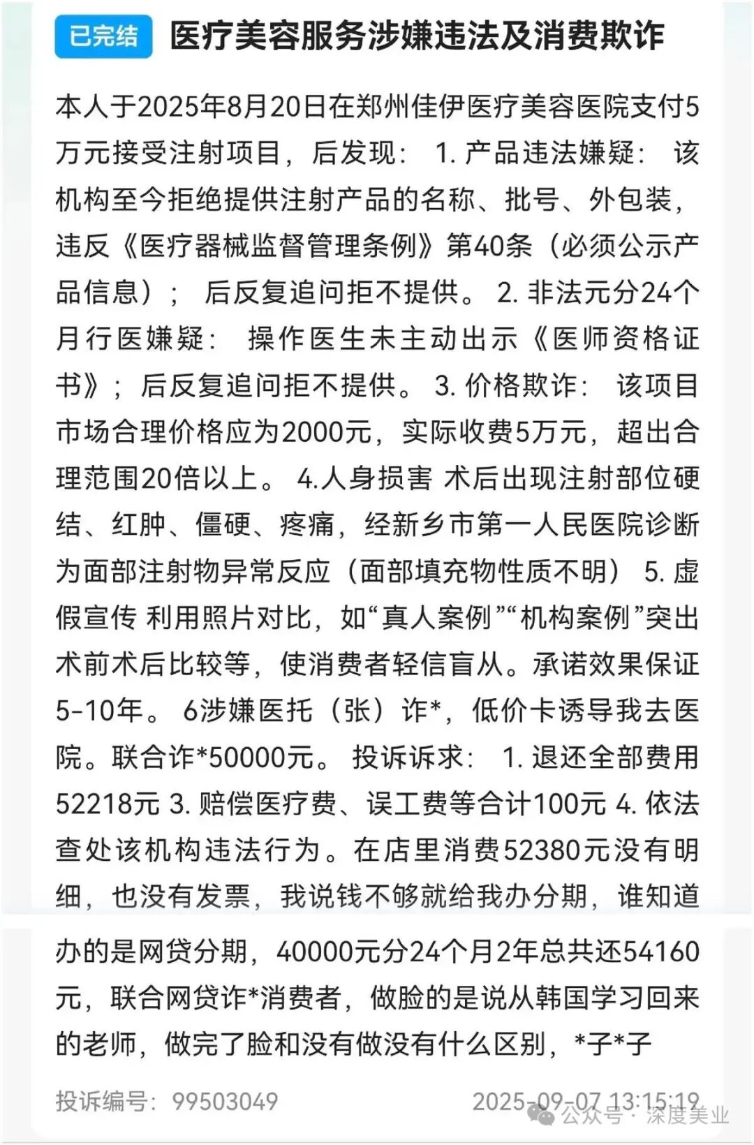 該消費(fèi)者投訴訴求包括退還全部費(fèi)用52218元,賠償醫(yī)療費(fèi)、誤工費(fèi)等,依法查處該機(jī)構(gòu)違法行為。該消費(fèi)者表示其在該機(jī)構(gòu)消費(fèi)52380元沒(méi)有明細(xì),沒(méi)有發(fā)票。該消費(fèi)者錢不夠支付時(shí),工作人員為其辦理了分期,但該消費(fèi)者并不知道辦的是網(wǎng)貸分期,40000元分期24個(gè)月總共還54160元。她認(rèn)為該機(jī)構(gòu)存在聯(lián)合網(wǎng)貸詐騙消費(fèi)者的情況。截至深度美業(yè)發(fā)稿前,該投訴因未能及時(shí)聯(lián)系到該機(jī)構(gòu)而被平臺(tái)自動(dòng)關(guān)閉。