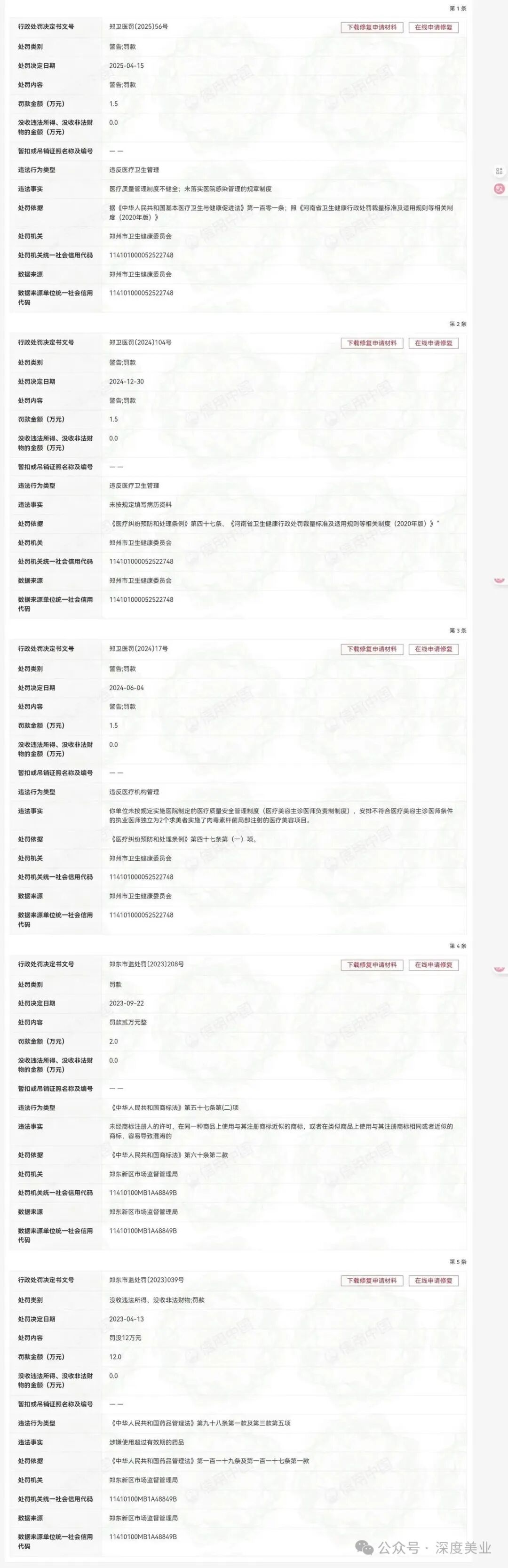 信用中國(guó)顯示,鄭州佳伊自2023年起到今年4月,累計(jì)受到相關(guān)監(jiān)管部門五次行政處罰。今年4月,還因違反醫(yī)療衛(wèi)生管理相關(guān)規(guī)定,存在醫(yī)療質(zhì)量安全管理制度不健全等原因被罰1.5萬(wàn)元。其余處罰包括未落實(shí)醫(yī)院感染管理的規(guī)章制度、 未按照規(guī)定填寫病歷資料 、 未按規(guī)定實(shí)施醫(yī)療質(zhì)量安全管理制度,安排不符合美容主診醫(yī)師條件的執(zhí)業(yè)醫(yī)師獨(dú)立為2名患者實(shí)施了肉毒素注射面部注射醫(yī)療美容項(xiàng)目。未經(jīng)商標(biāo)注冊(cè)人的許可,在同一種商品上使用與其注冊(cè)商標(biāo)近似的商標(biāo),或者在類似商品上使用與其注冊(cè)商標(biāo)相同或者近似的商標(biāo),容易導(dǎo)致混淆的行為。涉嫌使用超過(guò)有效期的藥品??傆?jì)罰款金額高達(dá)18.5萬(wàn)元。