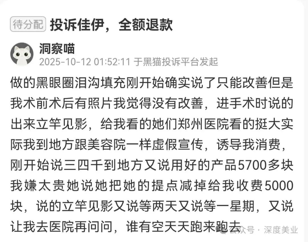 10月12日,一位消費(fèi)者于黑貓投訴平臺(tái)發(fā)起投訴,稱該消費(fèi)者做了黑眼圈淚溝填充項(xiàng)目,起初該機(jī)構(gòu)確實(shí)表示只能改善,該消費(fèi)者留存了術(shù)前術(shù)后照片,認(rèn)為術(shù)后結(jié)果未實(shí)現(xiàn)改善效果。該消費(fèi)者表示,進(jìn)入手術(shù)環(huán)節(jié)時(shí),該機(jī)構(gòu)稱術(shù)后效果立竿見(jiàn)影,還向該消費(fèi)者展示機(jī)構(gòu)的相關(guān)照片。該消費(fèi)者提到,照片里看起來(lái)規(guī)模較大,實(shí)際該消費(fèi)者到店后發(fā)現(xiàn)此處與美容院無(wú)異,存在虛假宣傳、誘導(dǎo)該消費(fèi)者消費(fèi)的情況。
