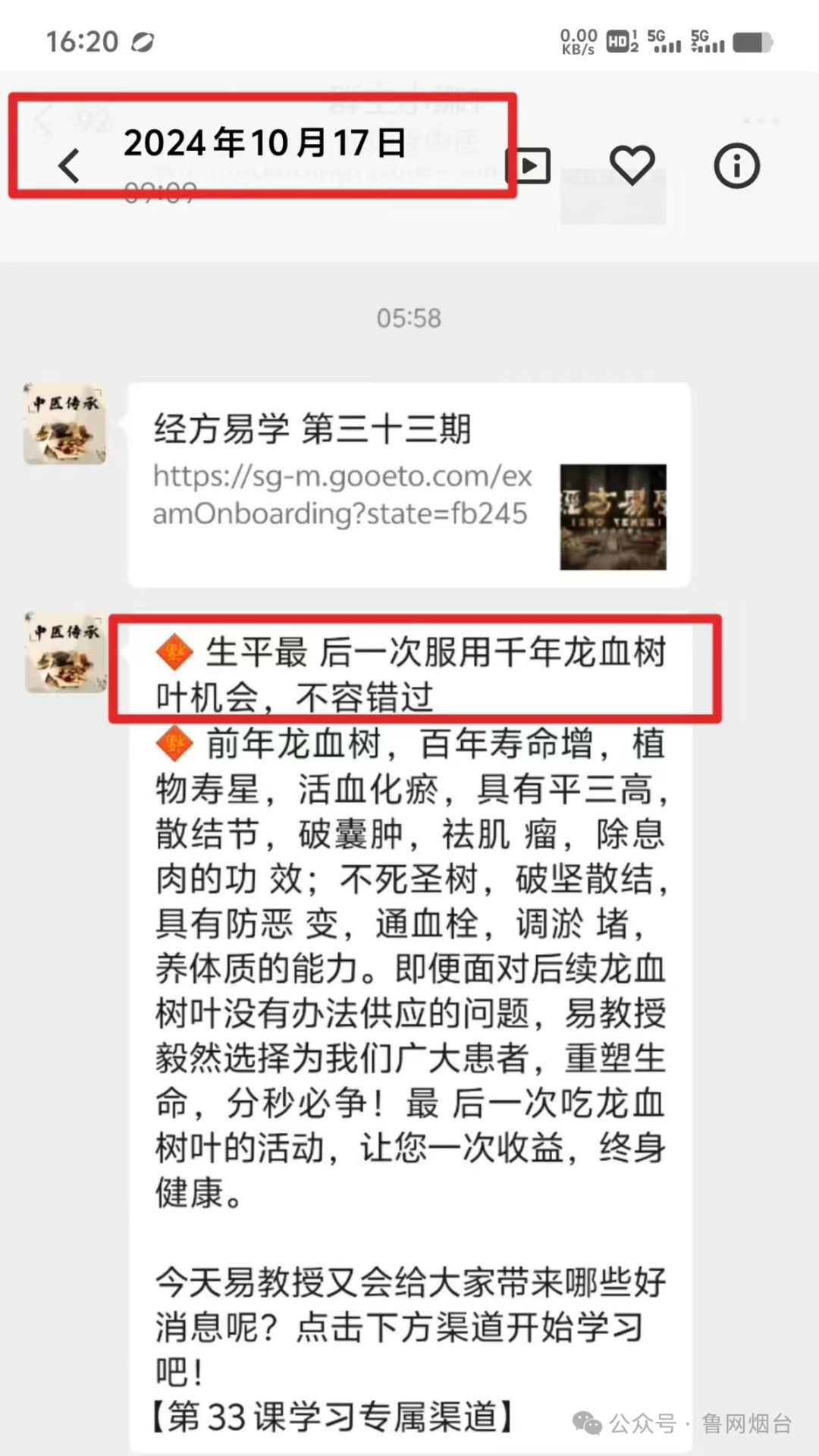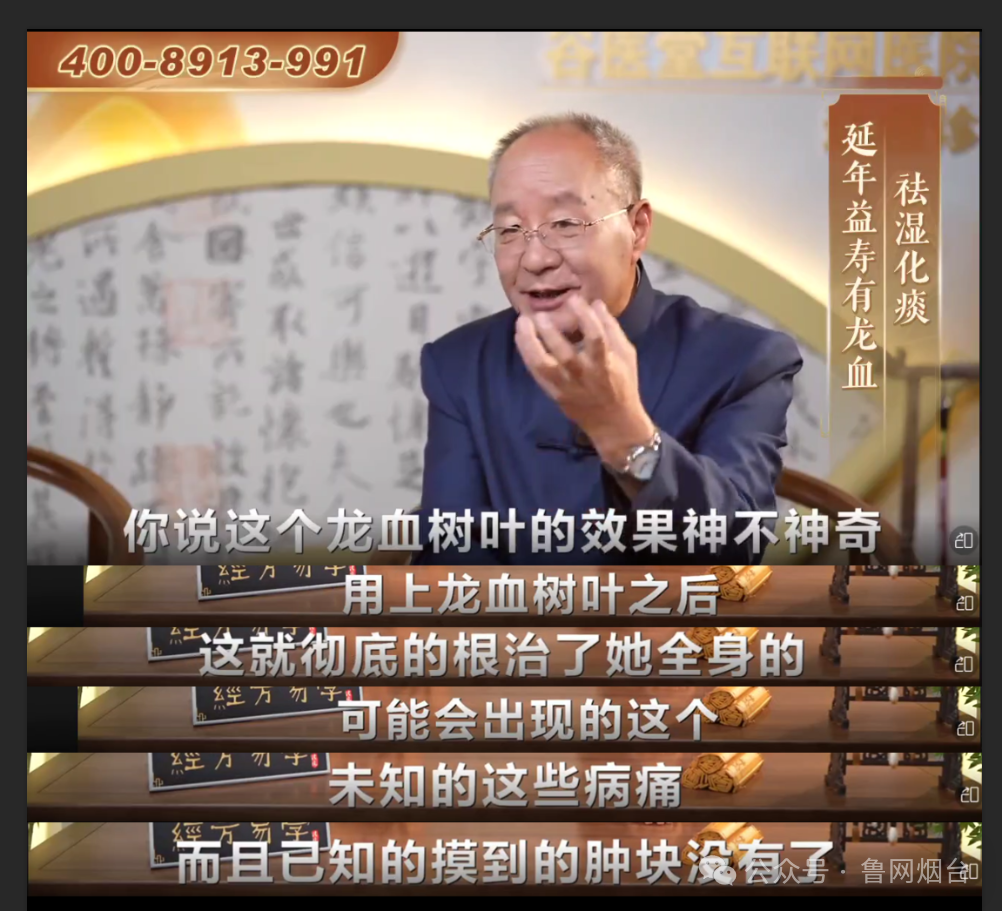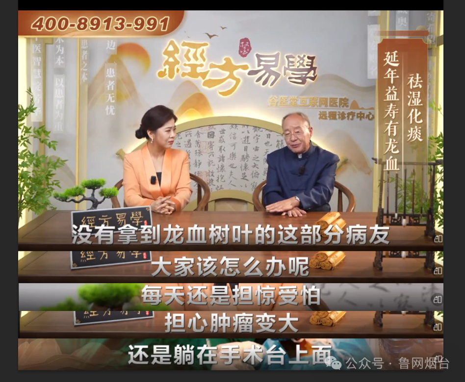 黃女士的母親出于對(duì)易法銀教授權(quán)威身份的信任,購(gòu)買了價(jià)值不菲的“龍血樹(shù)葉破壁飲片”。使用兩個(gè)周期后,她的身體疾病癥狀并未得到緩解。今年1月份,黃女士的母親再次被拉入另一個(gè)微信群,群內(nèi)還在播放《經(jīng)方易學(xué)》的視頻,這次除了主持人的衣服顏色有變化,其他內(nèi)容幾乎完全一樣,依然在推銷“龍血樹(shù)葉破壁飲片”?;叵肫鹑ツ暌追ㄣy教授節(jié)目中講述的“龍血樹(shù)葉”極為稀缺,是“生平最后一次服用千年龍血樹(shù)葉的機(jī)會(huì)了”,黃女士的母親意識(shí)到自己可能踩進(jìn)銷售陷阱。