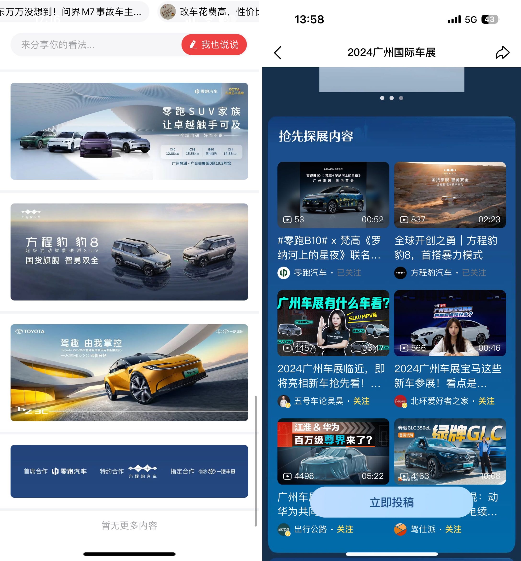 在車展開幕前期,今日頭條與抖音聯(lián)合發(fā)起廣州車展官方話題,在今日頭條端、懂車帝端上線#2024廣州國際車展 征文活動,聚合權(quán)威車展預(yù)告信息,助力用戶規(guī)劃觀展日程,促進參展企業(yè)與消費者的高效連接,引導(dǎo)用戶完成從車展內(nèi)容到活動,再到品牌的信息閉環(huán),全面助攻車展內(nèi)容發(fā)酵。