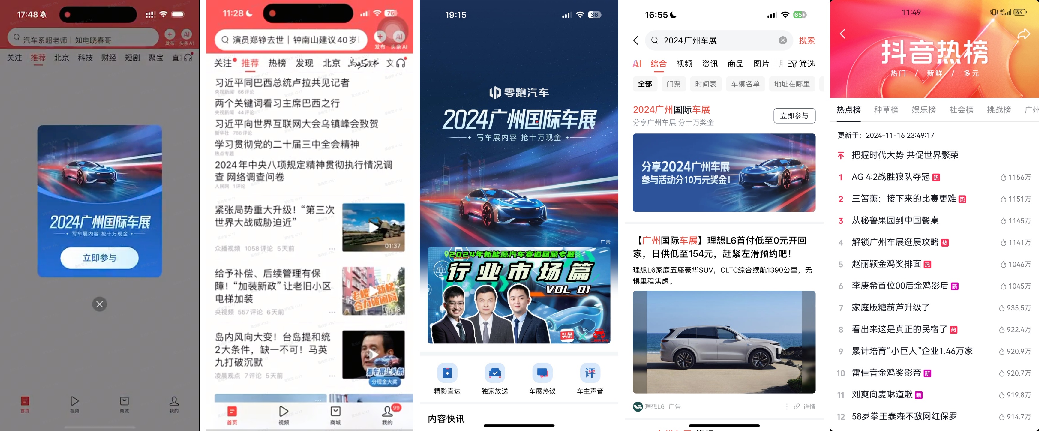 11月15日,今日頭條APP為廣州車展推出專屬定制頻道及搜索卡,并在車展期間上線了首頁彈窗、掛件等優(yōu)質(zhì)資源位,一站式聚合車展精彩快訊多元內(nèi)容,結(jié)合不同客群需求組合平臺優(yōu)質(zhì)資源,最大化聚焦新車用戶核心關(guān)注點,實時更新專業(yè)車展信息。