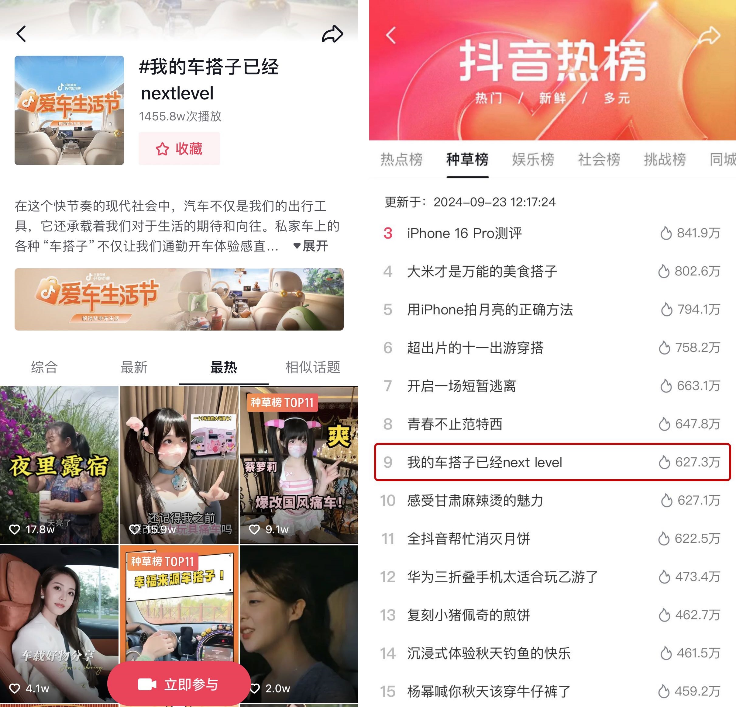 抖音商城好物市集|愛車生活節(jié)敏銳地捕捉到了這一趨勢,并以“我的車搭子已經(jīng)next level”為核心話題,打造了一個能夠引發(fā)廣泛共鳴的趨勢熱點,不僅滿足了用戶對于個性化、高質(zhì)量汽車用品的需求,還通過社交媒體的力量促進了內(nèi)容的廣泛傳播,進一步加深了品牌與消費者之間的情感連接。
