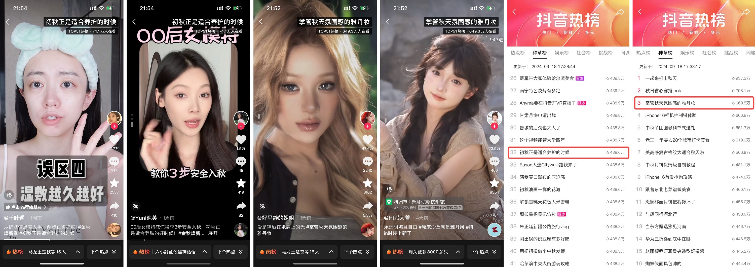 為了提升活動(dòng)熱度,活動(dòng)還策劃了換季方向的兩大熱點(diǎn)話題,吸引了@千葉遙、@九月Rue、@Yuni泡芙、@好平靜的姐姐、@肉松小淳(開學(xué)版)等超百位達(dá)人和商家參與,廣泛覆蓋興趣人群,實(shí)現(xiàn)活動(dòng)破圈。在大量達(dá)人趨勢內(nèi)容共創(chuàng)助推下,話題#初秋正是適合養(yǎng)護(hù)的時(shí)候、#掌管秋天氛圍感的雅丹妝 最高登上抖音種草榜TOP3,大量用戶圍觀學(xué)習(xí),話題熱度不斷攀升,1.5萬+商品配合SEO優(yōu)化,搭配“初秋補(bǔ)水修護(hù)”和“雅丹妝造好物”等趨勢關(guān)鍵詞的搜索引導(dǎo),進(jìn)一步刺激消費(fèi)欲望,促進(jìn)商城轉(zhuǎn)化。