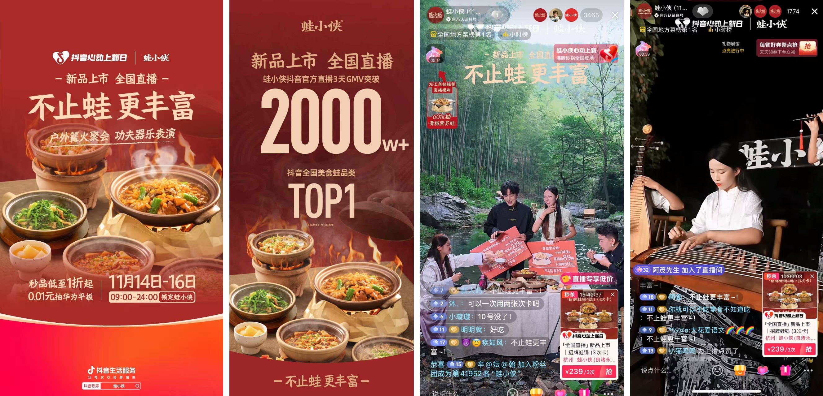 充滿 “俠風” 特色的蛙小俠品牌在“抖音心動上新日”特別推出了沸騰砂鍋蛙系列美食,圍繞“不止蛙,更豐富”活動主題,不僅將傳統(tǒng)的鐵鍋升級為更具特色的砂鍋,還在鍋內融入了多種豐富食材,旨在賦予用戶更豐富多元的的味蕾體驗,同時在價格方面也展現出滿滿誠意,低至五折的優(yōu)惠讓消費者能夠輕松嘗鮮。在直播間的玩法上,蛙小俠進行了諸多創(chuàng)新嘗試。選址于戶外山谷場景,巧妙穿插主理人空降直播間、東方文化古典演繹等互動環(huán)節(jié),不僅提升了直播的趣味性和觀賞力,更彰顯了蛙小俠“堅守文化根基,傳承文化精髓”的品牌初心。此外,線下心動物料全面進店的舉措進一步強化了此次上新的曝光力度,打通了線下線上全渠道聯(lián)動,全力助推蛙小俠品牌餐飲交易額再創(chuàng)新高,不僅實現了新用戶人群的破圈傳播,還深度喚醒了老用戶的消費熱情。