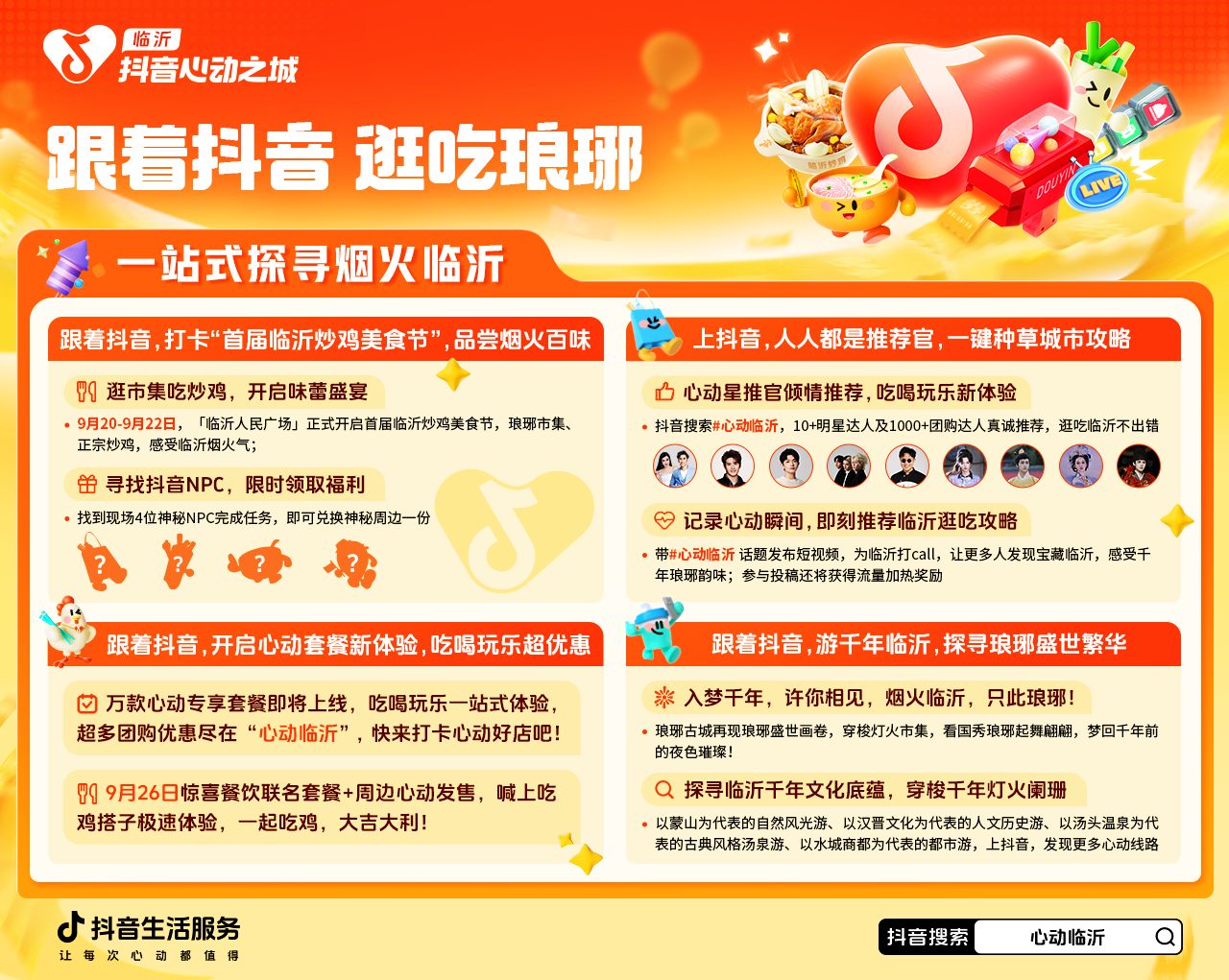 9月20日-10月9日,打開(kāi)抖音app,搜索「心動(dòng)臨沂」,和好友家人一起逛吃臨沂,見(jiàn)證文化與美食的雙向奔赴,感受一場(chǎng)穿越千年的夢(mèng)幻奇旅!也歡迎廣大用戶(hù)帶上話(huà)題#心動(dòng)臨沂 發(fā)布內(nèi)容,分享你眼中的特色臨沂,在抖音共繪臨沂城市名片! |