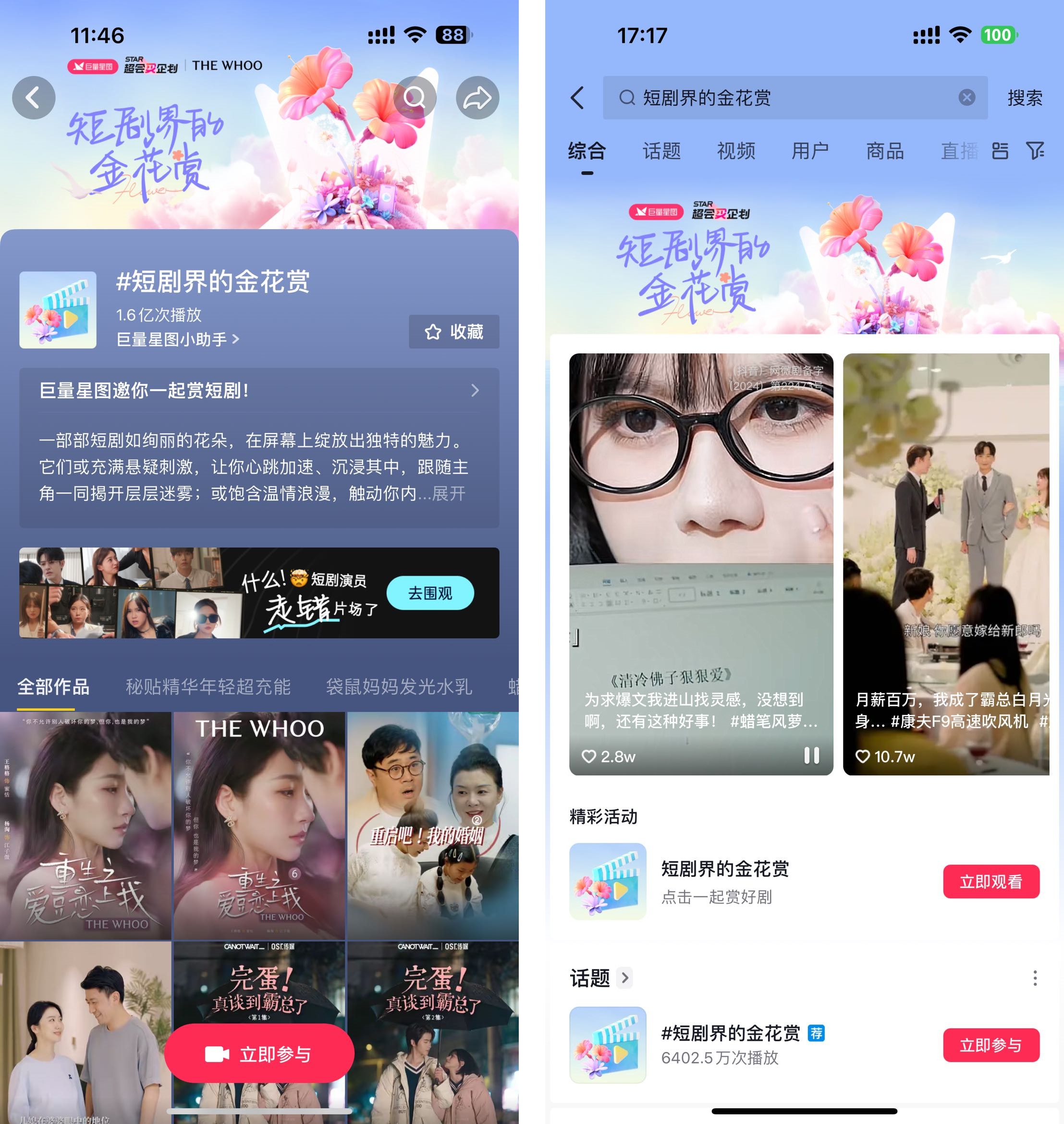 對此,巨量星圖發(fā)起達(dá)人定制短劇雙十一特別企劃「短劇界的金花賞」,首次邀約超頭部短劇達(dá)人聯(lián)動(dòng)上演官方創(chuàng)意TVC,并通過上線話題頁及短劇會(huì)場聚合品牌定制優(yōu)質(zhì)達(dá)人短劇等創(chuàng)意玩法,探索出品牌大促期間聲量爆發(fā)、破圈種草、后鏈路轉(zhuǎn)化提升的新路徑。截止目前,活動(dòng)主話題#短劇屆的金花賞 播放量已達(dá)4.8億,新增5A人群均遠(yuǎn)超預(yù)期!「短劇界的金花賞」究竟做對了什么?