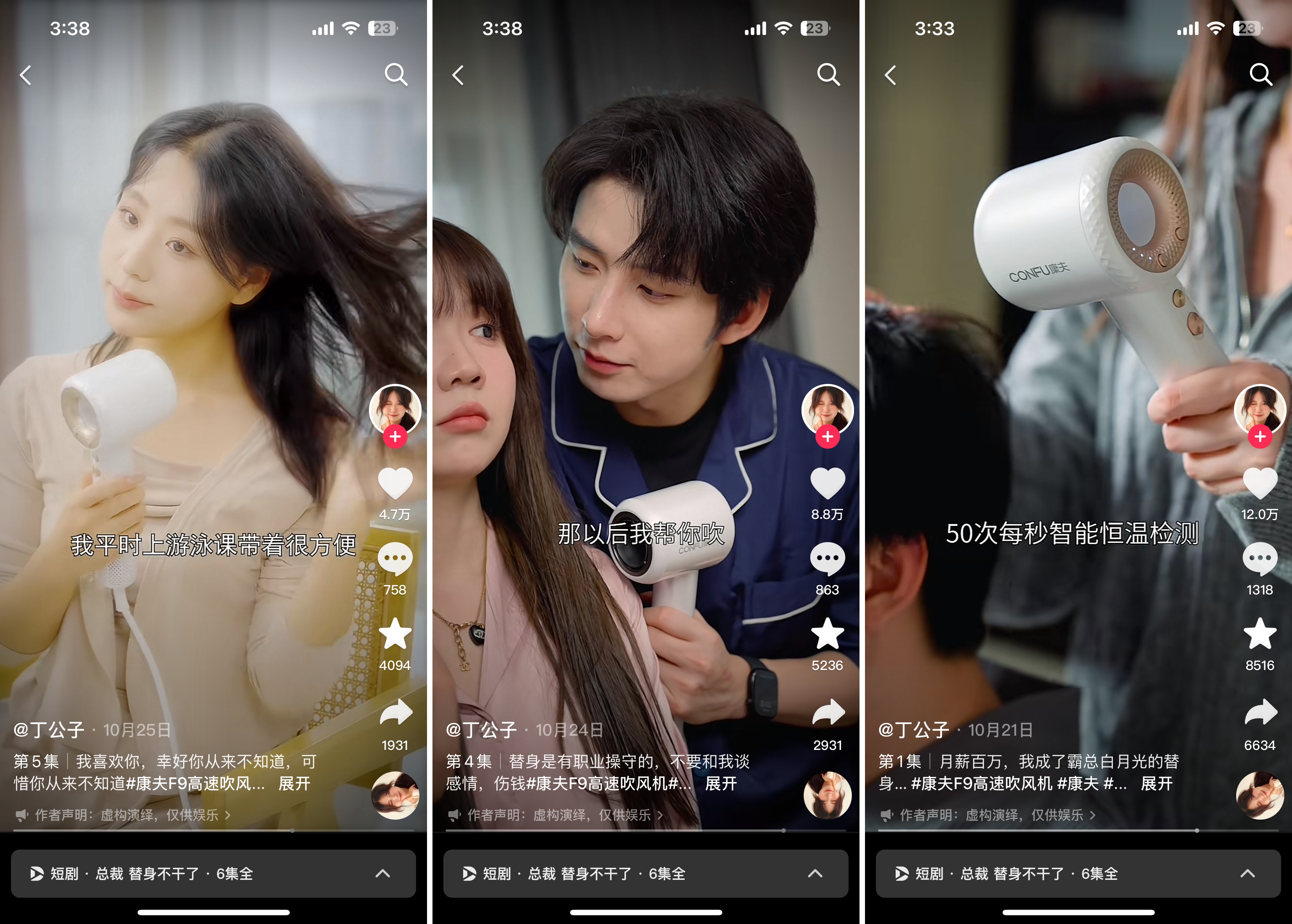 康夫夢幻聯(lián)動(dòng)@丁公子 實(shí)力上演霸道總裁題材定制短劇《總裁替身不干了》,將康夫F9高速吹風(fēng)機(jī)巧妙融入進(jìn)劇情中,最終總曝光獲得超6600萬播放量,新增5A人群超1400萬,新增A3人群超310萬, 創(chuàng)造了日均搜索UV提升700%的成績!