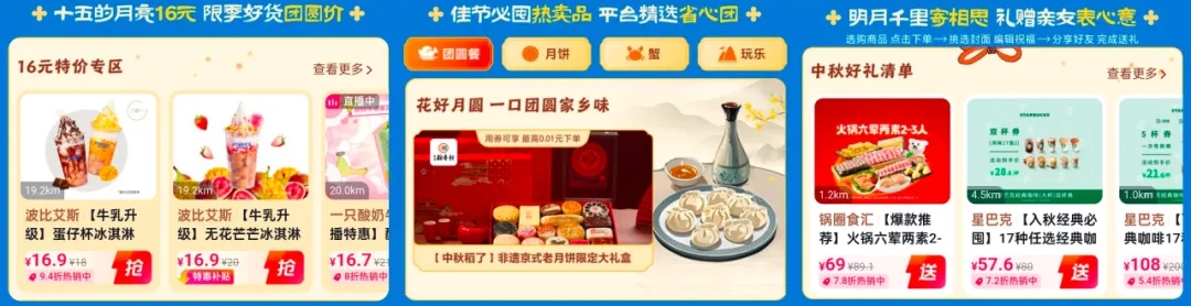 為了滿足消費(fèi)者對(duì)中秋特色品的個(gè)性化需求,「中秋團(tuán)圓季」特別上線的“佳節(jié)必囤熱賣品·平臺(tái)精選省心團(tuán)”專區(qū),匯聚了豐富多樣的好品供消費(fèi)者選擇。此外,活動(dòng)攜手蜜雪冰城、塔斯汀、益禾堂、書亦燒仙草、良品鋪?zhàn)印⒓稳A餅屋推出的禮品轉(zhuǎn)贈(zèng)玩法,既可以一鍵送好品,也能通過(guò)定制祝福傳達(dá)心意。這種“電子送禮”精準(zhǔn)捕獲了年輕人足不出戶送好禮的潛在需求,讓線下送禮場(chǎng)景在線上實(shí)現(xiàn)規(guī)?;瘮U(kuò)散,助力品牌進(jìn)一步拉近和消費(fèi)者的距離,持續(xù)提升品牌好感度。