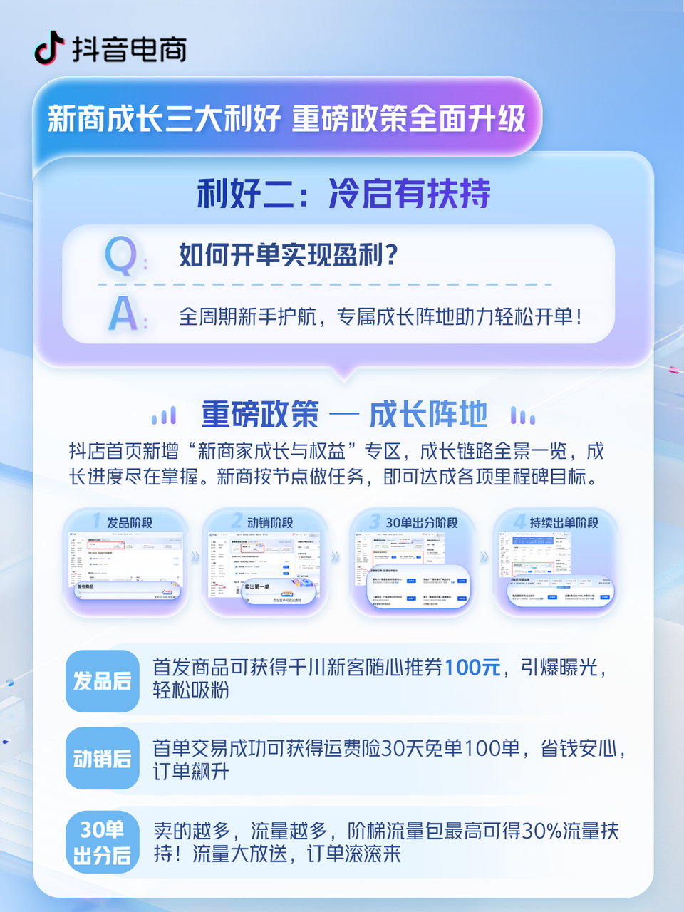 抖音電商對這個痛點有所察覺,“冷啟有扶持 ”就是為了在商家入駐之后幫助他們學(xué)習(xí)和成長、讓商家消除迷茫。針對此,平臺提出了“全周期新手保護(hù)”的概念,其中一個重要的幫助策略是在抖店官網(wǎng)上線了“新商家成長與權(quán)益”專區(qū),讓新商戶跟著平臺做任務(wù),在發(fā)品、動銷等各個冷啟動階段不斷完成目標(biāo)、獲得獎勵,進(jìn)而實現(xiàn)快速成長。例如,每當(dāng)商戶發(fā)布一個新品時,就會獲得千川的新客100元“隨心推”券等;賣出第一單后,可以獲得運費險30天100單免單的權(quán)益。