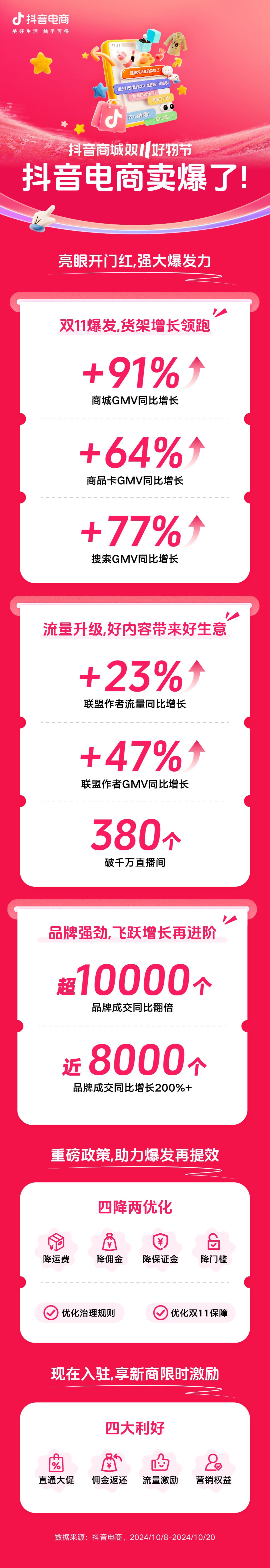 直播中,抖音電商總裁魏雯雯介紹,自10月8日起,抖音電商搶先啟動(dòng)雙11大促,平臺(tái)整體GMV爆發(fā)強(qiáng)勁,貨架場(chǎng)的爆發(fā)更加突出:商城GMV同比增長(zhǎng)91%,搜索GMV同比增長(zhǎng)77%,商品卡GMV同比增長(zhǎng)64%。