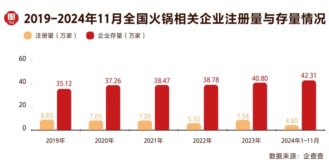 2024年,火鍋賽道的競爭進(jìn)入了前所未有的白熱化程度,與此同時增長還在繼續(xù)。企查查數(shù)據(jù)顯示,截至2024 年11月,火鍋存量企業(yè)有42.31萬家,較2023年有所上漲。
