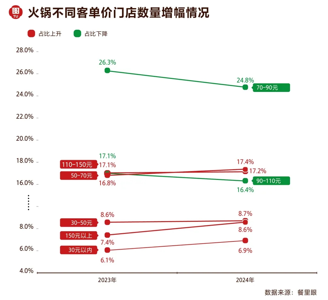 餐里眼數(shù)據(jù)顯示:2024年,在低價格帶,30元以內(nèi)客單價火鍋門店數(shù)量占比6.9%,30-50元占比8.7%,50-70元占比17.4%,相較于2023年均有所上漲;在高價格帶150元以上客單價火鍋門店數(shù)量占比8.6%,較去年有所上漲。