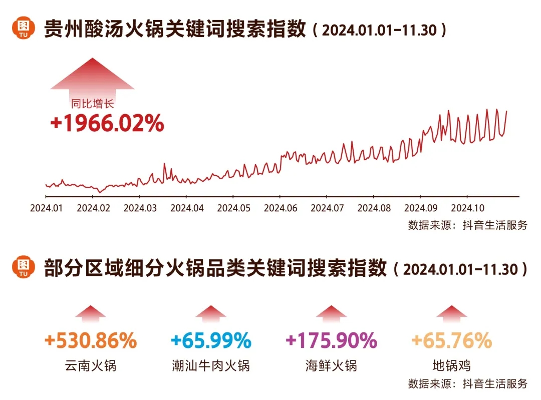 抖音火鍋關(guān)鍵詞搜索指數(shù)顯示,貴州酸湯火鍋同比增長1966.02%,是今年火鍋市場中的“黑馬品類”。海鮮火鍋、潮汕牛肉火鍋和地鍋雞等細(xì)分品類同樣熱度高漲,成為社交平臺的熱門搜索詞。