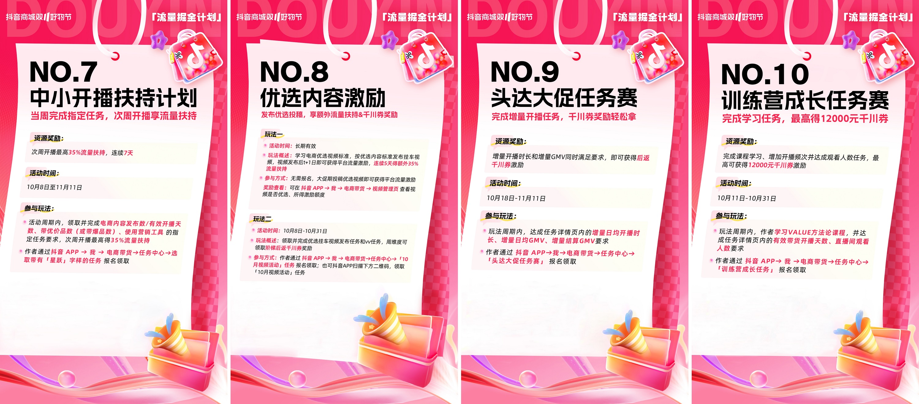 10月8日至11月11日期間,作者領取并完成指定任務,次周開播立享最高35%流量扶持,連續(xù)7天。