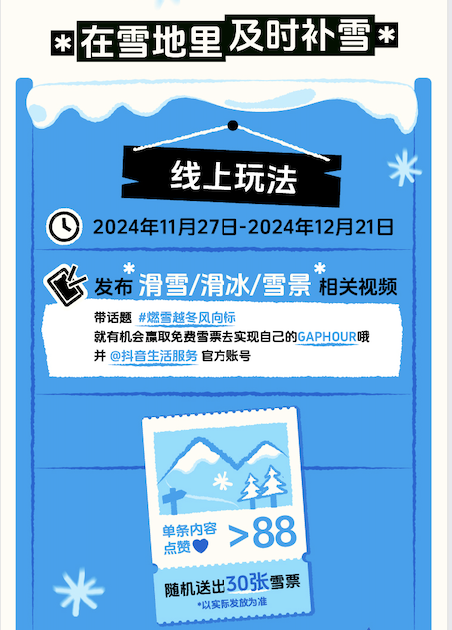除了線下的驚喜偶遇,線上也為大家準備了驚喜券包和雪票大獎。即日起至12月31日,打開抖音搜索「燃雪越冬風向標」,進入活動會場,188元驚喜券包等你領取,情緒快充補雪的同時,別忘了領券讓錢包「回回血」。