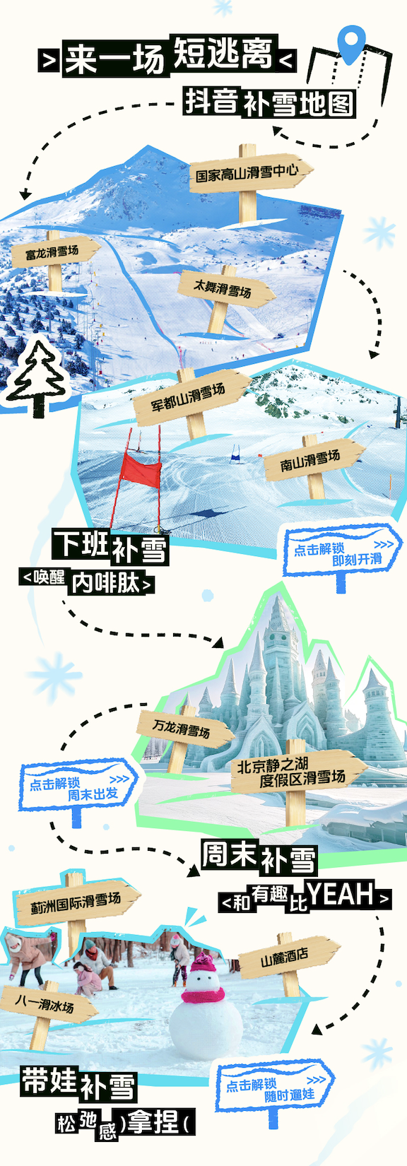 抖音生活服務捕捉了這一風尚,推出「燃雪越冬風向標」趨勢榜單,針對周內短逃離、周末出行體驗,或是遛娃放松的需求場景,通過優(yōu)選京津冀周邊雪場和冰場做攻略推薦,提供尋找「冬日專屬gap hour」的解決方案,和廣大雪友一起,開啟冬日療愈力時刻。