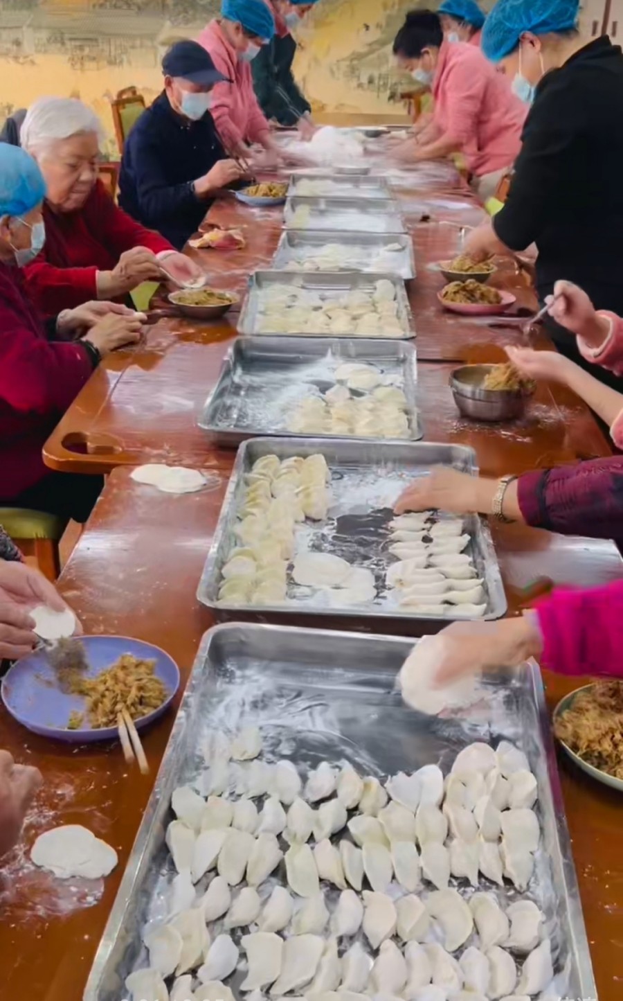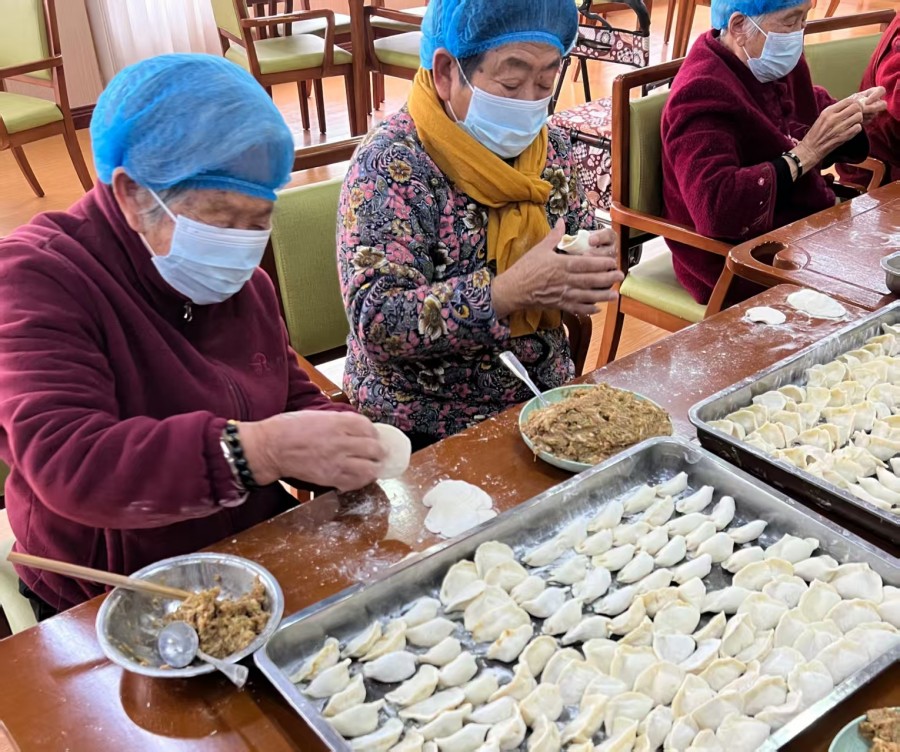 活動(dòng)當(dāng)天,公寓食堂早早布置妥當(dāng),桌上擺滿(mǎn)了面團(tuán)、餡料和工具。老人們興致勃勃地洗凈雙手,與工作人員、家屬一起動(dòng)手,揉面、搟皮、包餡,動(dòng)作嫻熟間笑語(yǔ)不斷。韭菜雞蛋、豬肉白菜等餡料香氣撲鼻,元寶形、月牙形的餃子漸次擺滿(mǎn)餐盤(pán),承載著團(tuán)圓與安康的寓意。幾位擅長(zhǎng)廚藝的長(zhǎng)者主動(dòng)擔(dān)起“指導(dǎo)老師”,手把手教年輕員工包餃子的技巧,暖意在手手相傳中流淌。