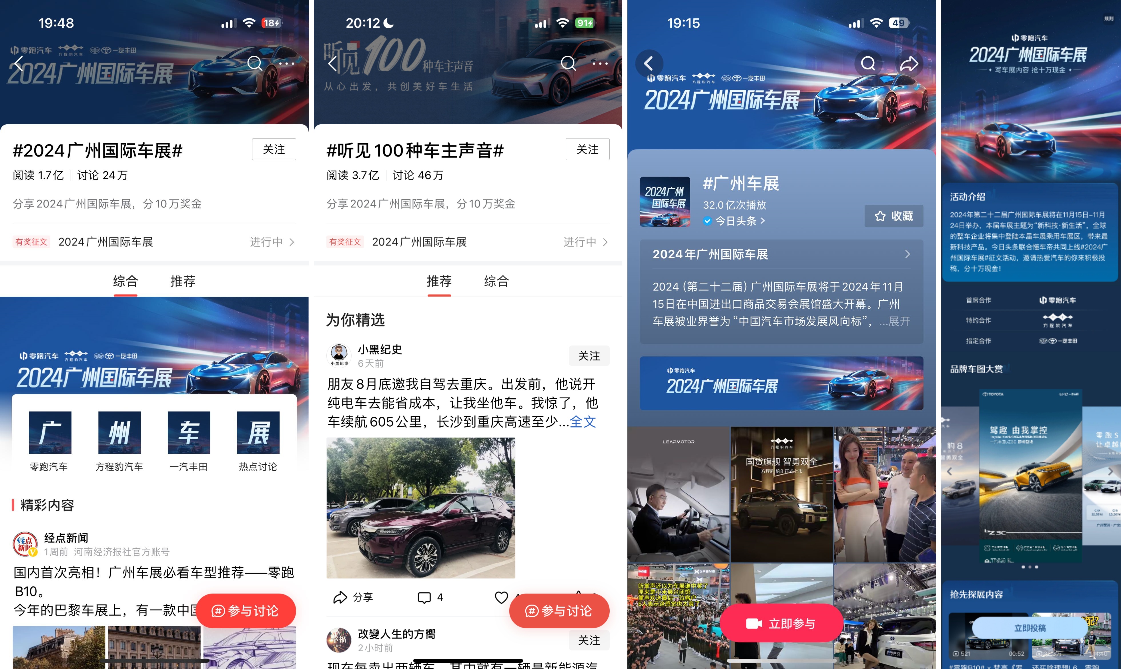 與此同時,今日頭條推出#聽見100種車主聲音 子話題,號召全民一起參與車展預熱話題投稿討論,通過用車年終盤點、親身駕駛體驗等多視角用車購車相關內容為用戶提供選車指南,截止11月26日,今日頭條、抖音端主話題#廣州車展 累計曝光35.7億,今日頭條主話題閱讀量3.6億,討論量37萬,今日頭條子話題累計閱讀量3.7億,討論量46萬。