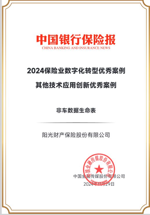 近日,由《中國(guó)銀行保險(xiǎn)報(bào)》主辦的以“提高數(shù)智化水平 助力高質(zhì)量發(fā)展”為主題2024金融業(yè)(保險(xiǎn))數(shù)字化轉(zhuǎn)型大會(huì)在廣東汕頭召開。會(huì)議同步發(fā)布2024中國(guó)保險(xiǎn)業(yè)數(shù)字化轉(zhuǎn)型優(yōu)秀案例,陽光財(cái)險(xiǎn)“非車數(shù)據(jù)生命表”項(xiàng)目憑借指標(biāo)配置和智能定價(jià)的技術(shù)創(chuàng)新,入選“2024保險(xiǎn)業(yè)數(shù)字化轉(zhuǎn)型優(yōu)秀案例”。