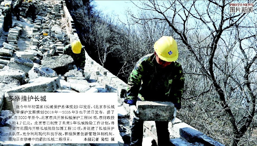 繼今年年初國家《長城保護總體規(guī)劃》印發(fā)后,《北京市長城文化帶保護發(fā)展規(guī)劃(2018年—2035年)》也于近日發(fā)布。據了解,自2000年至今,北京市共開展長城保護工程96項,市財政投入約4.7億元。北京市已制定了未來5年長城搶險工作計劃,將在全市范圍內開展長城搶險加固工程10項,并組建了長城保護員隊伍,充分利用現代科技手段,積極探索創(chuàng)新管理體制機制。圖為正在修繕中的箭扣長城二期項目。 本報記者陸愷攝