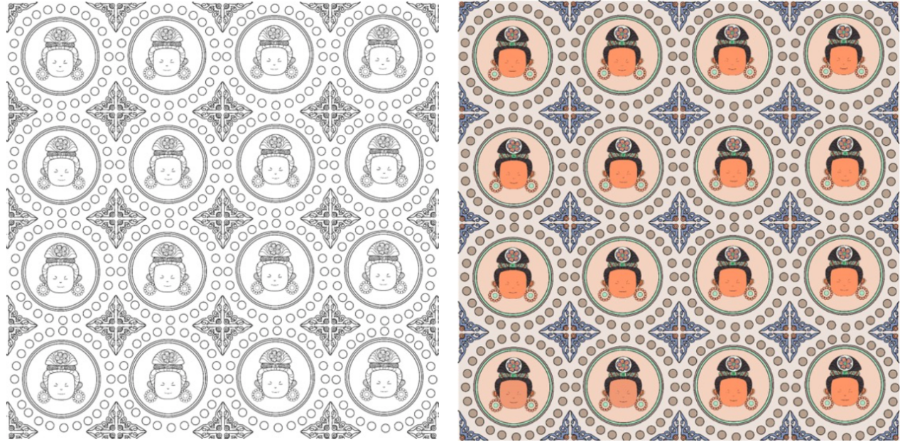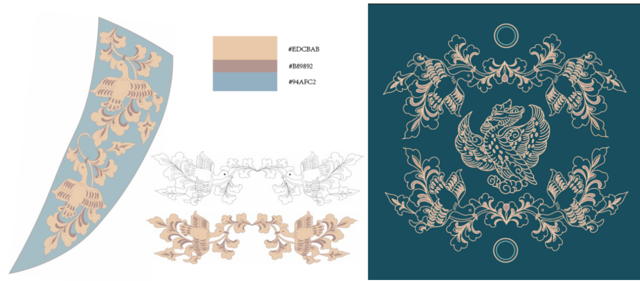 根據(jù)敦煌壁畫中人物服裝紋樣的提取與創(chuàng)作 此外,《芙桂雙錢》《秋月之菊》《云上蘭君》等展覽作品以傳統(tǒng)的花草植物紋樣為創(chuàng)作的基本元素,并在構(gòu)圖中巧妙融入了商業(yè)符號(hào),而這些都僅是傳統(tǒng)元素融入現(xiàn)代紋樣設(shè)計(jì)的小小嘗試,未來還有很大的拓展空間。