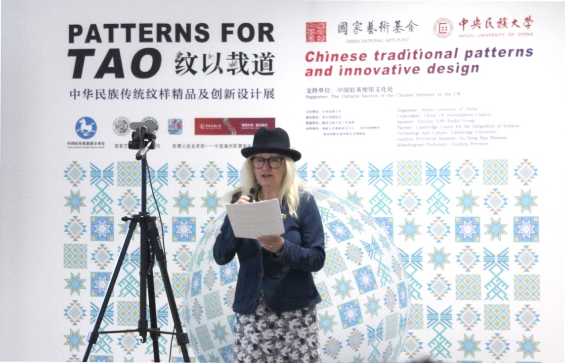 劍橋大學(xué)劍橋科文中心主任、英國(guó)皇家學(xué)會(huì)院士Nicola Clayton教授主持并致歡迎辭 此次“紋以載道”創(chuàng)新設(shè)計(jì)展是中國(guó)傳統(tǒng)紋樣在劍橋大學(xué)的首次展出,得到了兩校及中國(guó)駐英使館的高度重視,也為中西方在文化交流上提供了新模式。作為創(chuàng)新的切入點(diǎn),民族紋樣能夠從一個(gè)看似很小眾的藝術(shù)層面激發(fā)人的興趣,從而引導(dǎo)人們?nèi)ヌ剿鞑┐缶畹闹腥A文化,對(duì)于未來擴(kuò)大民族文化在國(guó)際間的傳播提供了重要的現(xiàn)實(shí)依據(jù)。 據(jù)悉,此次展出的100多幅作品,都是經(jīng)過多方反復(fù)考量、精挑細(xì)選過的具有代表性的作品,囊括了彝族、苗族、藏族、壯族等數(shù)十個(gè)少數(shù)民族紋樣在內(nèi)的藝術(shù)作品,包含圖騰文化、樸素信仰、神話傳說等,融合了蠟染、扎染、刺繡、銀飾工藝等多種文化在內(nèi)的民族藝術(shù)。