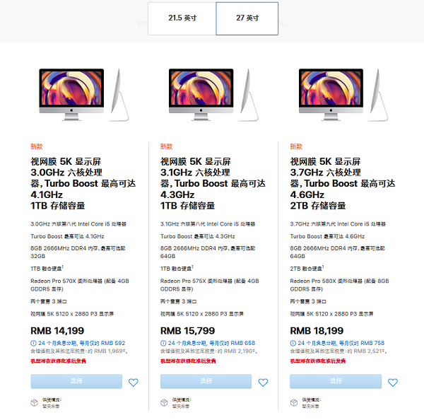 據(jù)蘋果官網(wǎng)介紹, 27英寸款iMac配置了最高為第九代六核或八核處理器,兩款產(chǎn)品內(nèi)存均標(biāo)配8GB 2666MHz DDR4,21.5英寸款可選配16GB或32GB RAM。硬盤則都是標(biāo)配1TB融合硬盤,用戶可選配更快純SSD固態(tài)硬盤。