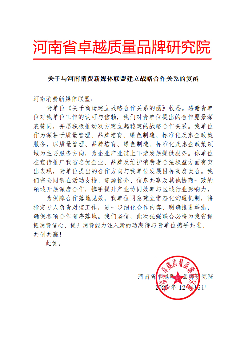 該院長期致力于質(zhì)量提升、品牌發(fā)展與企業(yè)競爭力評估的研究,在行業(yè)內(nèi)發(fā)揮著重要智庫與咨詢服務作用。此次戰(zhàn)略合作將充分發(fā)揮雙方資源優(yōu)勢,通過聯(lián)合開展品牌巡禮、質(zhì)量測評、消費洞察報告發(fā)布等項目,持續(xù)輸出權威內(nèi)容,增強公眾對本土品牌的信任感。依托新媒體傳播勢能與該院的專業(yè)背書,助力企業(yè)講好品牌故事,推動形成崇尚質(zhì)量、追求卓越的良好氛圍,為河南經(jīng)濟高質(zhì)量發(fā)展注入新動能。