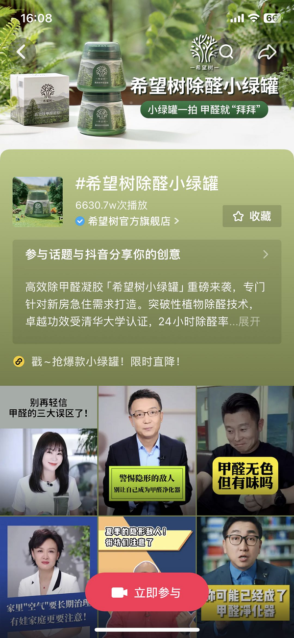 之于家具家裝品牌,「抖in心動(dòng)家·質(zhì)造中國家」這一活動(dòng)不僅是釋放「價(jià)格力」、將流量轉(zhuǎn)化為增量的重要機(jī)遇,更是打造「爆品」、流量破圈的關(guān)鍵節(jié)點(diǎn)。以專業(yè)除醛品牌「希望樹」為例,品牌攜高效除醛凝膠「希望樹小綠罐」重磅來襲,入選抖音商城質(zhì)造中國家趨勢金榜,聯(lián)合達(dá)人共創(chuàng)打造#希望樹除醛小綠罐 話題,視頻播放量高達(dá)6633.7萬,結(jié)合商城搜索推薦詞干預(yù)等動(dòng)作精準(zhǔn)導(dǎo)流至站內(nèi)店鋪,并以強(qiáng)大「價(jià)格力」承接流量轉(zhuǎn)化,一舉打爆小綠罐核心單品。