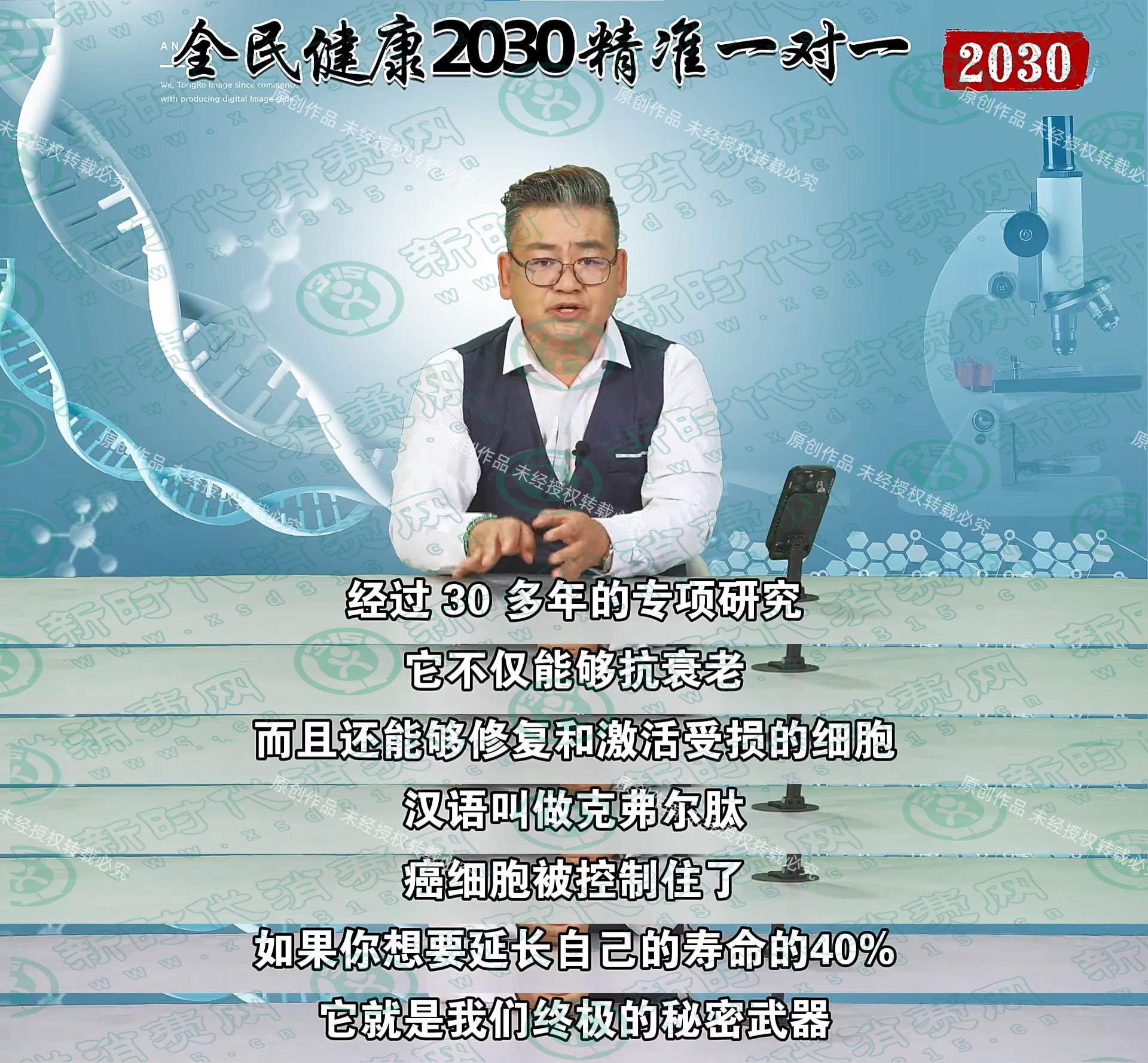 2025年以來,有多名消費者反映,在全國多個群聊中,出現(xiàn)一檔《全民健康2030精準一對一》私域直播課,內容聲稱“KFET克弗爾肽由8位諾貝爾獎獲得者、19位著名科學家鼎力推薦,激活長壽蛋白、延緩衰老、突破基因極限、延年益壽,讓活到150歲不再是夢。”特邀嘉賓主講人為張運杰,其在視頻中顯示的頭銜有中國健康養(yǎng)老慢性病健康管理工程青年會員、中國文化科普大講堂宣傳部部長、三家愛心養(yǎng)老基地的董事長、黑龍江商會副會長等。經查,該課程存在如下問題: