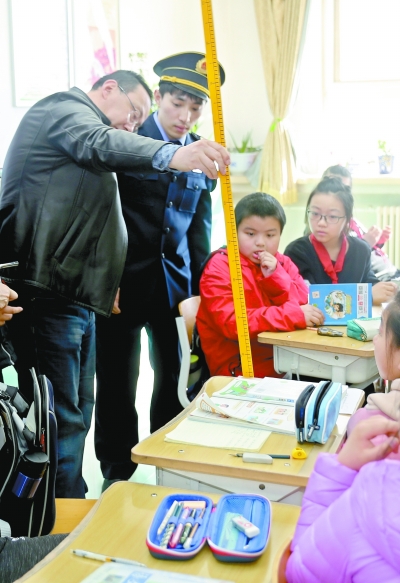 昨天,在北京市通州區(qū)教師研修中心實驗學(xué)校,衛(wèi)監(jiān)所工作人員正在與校方共同測量學(xué)生課桌面高度。記者 方非攝 未來,北京市衛(wèi)生監(jiān)督機構(gòu)將對本市中小學(xué)教室采光、照明及黑板、課桌椅設(shè)置情況進行隨機抽查、記錄并向社會公開。昨天,由北京市衛(wèi)生計生監(jiān)督機構(gòu)發(fā)起的“開學(xué)第一課——近視防控普法宣傳進校園”活動在全市同時舉行。 近年來,我國兒童青少年近視率居高不下且不斷攀升,近視低齡化、重度化日益嚴(yán)重。2016-2017學(xué)年度,北京市各類學(xué)校學(xué)生視力不良檢出率分別為:小學(xué)46.8%、初中78.0%、高中89.0%。 為降低兒童青少年近視發(fā)生率,北京市衛(wèi)生和計劃生育監(jiān)督機構(gòu)在全市發(fā)起了以“關(guān)愛眼睛,環(huán)境達標(biāo);防控近視,執(zhí)法保障——衛(wèi)生監(jiān)督在行動”為主題的普法宣傳活動,未來將積極向中小學(xué)校發(fā)放課桌椅型號對照表,普及《學(xué)校衛(wèi)生工作條例》和采光照明等教學(xué)環(huán)境國家相關(guān)標(biāo)準(zhǔn)。 中小學(xué)校課桌椅型號對照表能方便學(xué)生快速找到符合自己身高的課桌椅型號。 記者看到,按照身高不同,學(xué)生課桌椅從0到10,被分為11個不同型號,每一個型號都有嚴(yán)格對應(yīng)的課桌面高和課椅座面高。例如身高在113到127厘米的學(xué)生,其適合的課桌椅型號為9號,桌面高為520毫米,課椅座面高為290毫米。 而學(xué)校衛(wèi)生相關(guān)國家標(biāo)準(zhǔn)規(guī)定:單側(cè)采光的教室光線應(yīng)從學(xué)生座位左側(cè)射入,雙側(cè)采光的教室主采光窗應(yīng)設(shè)在左側(cè);教室照明配備40瓦熒光燈9盞以上;燈具距桌面的懸掛高度為1.7至1.9米;黑板照明應(yīng)設(shè)2盞40瓦熒光燈,并配有燈罩;黑板尺寸小學(xué)≥1m×3.6m,中學(xué)≥1m×4.0m;教室前排課桌前緣與黑板應(yīng)有2米以上距離…… 為保護青少年視力,北京市衛(wèi)生和計劃生育監(jiān)督所還專門制定了“落實八部委《綜合防控兒童青少年近視實施方案》的工作方案”。今年,各級衛(wèi)生計生監(jiān)督機構(gòu)將以“雙隨機”的方式開展中小學(xué)校的教學(xué)環(huán)境監(jiān)督抽檢工作,并按要求對檢查情況予以記錄并公布,具體抽檢項目包括:課桌椅、教室采光、照明、黑板等。 “每學(xué)期初,學(xué)校要根據(jù)學(xué)生的身高調(diào)整課桌椅高度,每個班級至少要設(shè)置兩種型號的課桌椅,學(xué)生課桌椅分配符合率要大于等于80%?!?北京市衛(wèi)生和計劃生育監(jiān)督所學(xué)校衛(wèi)生科科長張宇介紹。 記者了解到,目前本市約有1800余所中小學(xué)校,今后各級衛(wèi)生監(jiān)督機構(gòu)將按照《學(xué)校衛(wèi)生工作條例》《國家學(xué)校體育衛(wèi)生條件試行基本標(biāo)準(zhǔn)》《中小學(xué)校教室采光和照明衛(wèi)生標(biāo)準(zhǔn)》《學(xué)校課桌椅功能尺寸及技術(shù)要求》等相關(guān)法規(guī)及國家標(biāo)準(zhǔn)要求,對中小學(xué)教室的采光照明等教學(xué)環(huán)境進行監(jiān)督抽檢,并由疾控機構(gòu)或取得CMA資質(zhì)認(rèn)證的第三方檢測機構(gòu)出具檢測報告,判定學(xué)校的教學(xué)環(huán)境是否符合要求。 “監(jiān)督檢查中發(fā)現(xiàn)學(xué)校教學(xué)環(huán)境存在問題的,我們會及時報告所屬衛(wèi)生健康行政部門,并通過衛(wèi)生健康行政部門及時通報同級教育行政部門,促進問題得到及時有效解決。如果違反國家強制標(biāo)準(zhǔn)的,我們會嚴(yán)格依法給予警告處罰并責(zé)令改正?!睆堄钫f。 據(jù)了解,各區(qū)衛(wèi)生計生委要統(tǒng)籌協(xié)調(diào)疾控機構(gòu)開展監(jiān)督抽檢工作,建立長效機制,將監(jiān)督部門監(jiān)督抽檢工作與疾控機構(gòu)承擔(dān)的法定學(xué)校衛(wèi)生檢測職責(zé)及任務(wù)有效結(jié)合,實現(xiàn)數(shù)據(jù)對接。疾控機構(gòu)不具備相應(yīng)檢測能力的,可由轄區(qū)衛(wèi)計委牽頭組織第三方檢測機構(gòu)承擔(dān)檢測任務(wù)。北京市衛(wèi)生和計劃生育監(jiān)督所將對全市兒童青少年近視防控工作進行指導(dǎo)和督導(dǎo),同時還將積極支持并配合組建全市兒童青少年近視防治和視力健康防治專家組。(記者 劉歡)