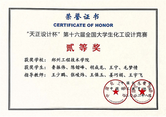 近日,第十六屆全國(guó)大學(xué)生化工設(shè)計(jì)競(jìng)賽組委會(huì)正式公布了2022年比賽結(jié)果,鄭州工程技術(shù)學(xué)院化工食品學(xué)院化學(xué)工程與工藝專(zhuān)業(yè)學(xué)子魯振偉、陳鍇峰、孟砥、王寧和毛夢(mèng)情等學(xué)生組成的“制醇聯(lián)盟”隊(duì),經(jīng)過(guò)單項(xiàng)打分、線(xiàn)上匯報(bào)和線(xiàn)上答辯,從華中賽區(qū)脫穎而出,榮獲國(guó)賽二等獎(jiǎng)。 全國(guó)大學(xué)生化工設(shè)計(jì)競(jìng)賽由中國(guó)化工學(xué)會(huì)和中國(guó)化工教育協(xié)會(huì)聯(lián)合主辦,為全國(guó)普通高校大學(xué)生競(jìng)賽排行榜賽事之一、教育部全國(guó)性A類(lèi)賽事,是目前影響力最大、參賽隊(duì)伍最多、最具挑戰(zhàn)性、認(rèn)可度最高的全國(guó)高?;ゎ?lèi)本科生學(xué)科競(jìng)賽。2022年全國(guó)大學(xué)生化工設(shè)計(jì)競(jìng)賽分為賽區(qū)決賽(全國(guó)選拔賽)和全國(guó)總決賽兩個(gè)階段,全國(guó)共有415所高校的2939支隊(duì)伍報(bào)名參加選拔賽,參賽人數(shù)近1.5萬(wàn)人,經(jīng)過(guò)激烈角逐,60支優(yōu)秀代表隊(duì)伍晉級(jí)參加華東理工大學(xué)承辦的全國(guó)總決賽。