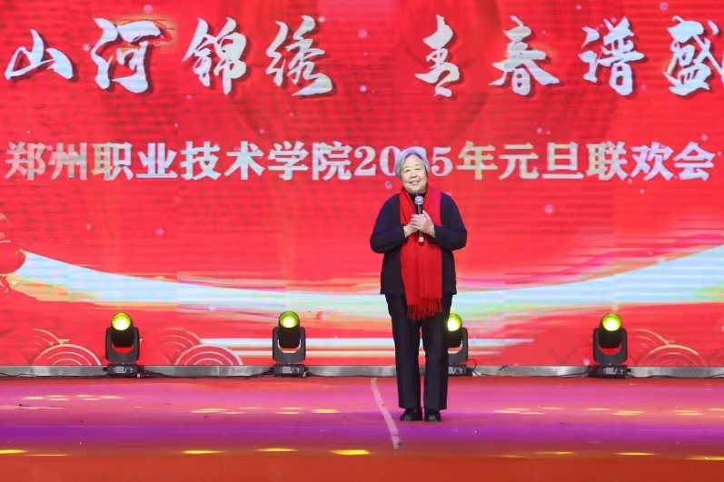 鄭州職業(yè)技術(shù)學(xué)院原副校長(zhǎng)周慧玲在學(xué)校元旦聯(lián)歡會(huì)現(xiàn)場(chǎng)為全校師生送上祝福并表演詩(shī)朗誦《沁園春·長(zhǎng)沙》